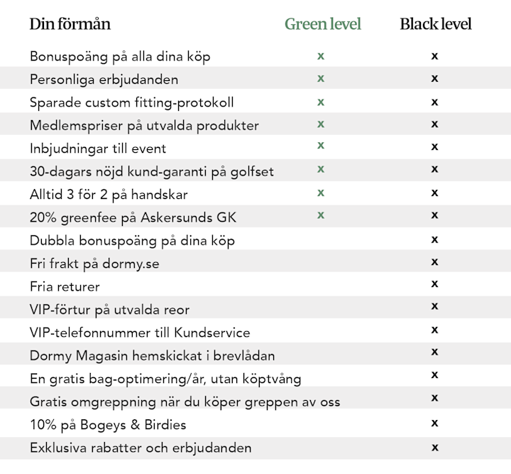 Medlemskapet i Dormy Club är kostnadsfritt, kan avslutas när du själv väljer det och du kan bestämma hur du vill att vi kommunicerar med dig. Medlemskapet är digitalt och vi hjälper dig att hålla ordning på värdecheckar, bonuscheckar och andra förmåner du har rätt till när du besöker våra golfvaruhus, Dormy Outlet eller dormy.se. När du samlat ihop 2 000 poäng får du 50 kronor i bonus som aktiveras vid nästa månadsskifte och därefter är du inne i vår bonustrappa och får bonusutbetalningar efter hur mycket du handlar för. Bonusen är giltig i sex månader från aktiveringstillfället och kan lösas in mot varor i våra golfvaruhus, Dormy Outlet eller dormy.se. På Black level nollställs bonuspoängen alltid vid årsskiftet, men du blir kvar på Black level även nästkommande år och får ta del av alla förmånerna förutom dubbla bonuspoäng.