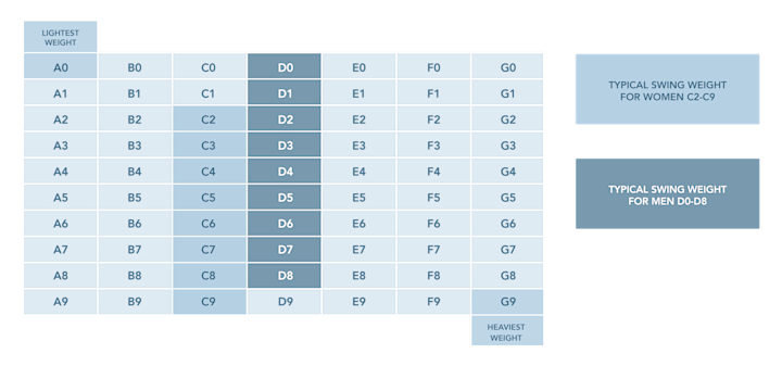 För herrklubbor ligger standarden ofta mellan D0–D8, medan damklubbor vanligtvis hamnar runt C2–C9. Wedgar har ofta något högre svingvikt än till exempel drivern – just för att ge mer kontroll i de kortare slagen. Eftersom män generellt sett har en mer aggressiv golfsving än kvinnor ser vi ofta en tyngre svingvikt på herrklubbor i standardutförande. Men är du en snabbsvingande kvinna kan det vara en god idé att addera lite vikt till klubban för att få rätt balans och svingvikt så att den harmoniserar med ditt tempo.